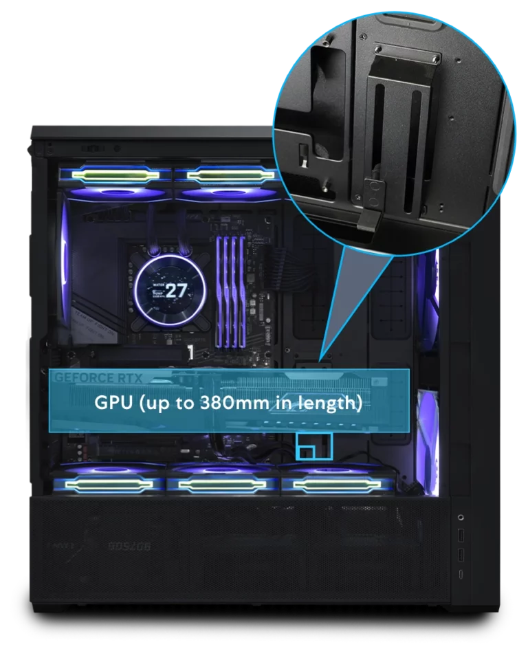 LANCOOL 217 INF תומך בכרטיס מסך באורך של עד 380 מ״מ, וכולל תושבת Anti-Sag מתכווננת שמבטיחה התאמה יציבה ובטוחה.