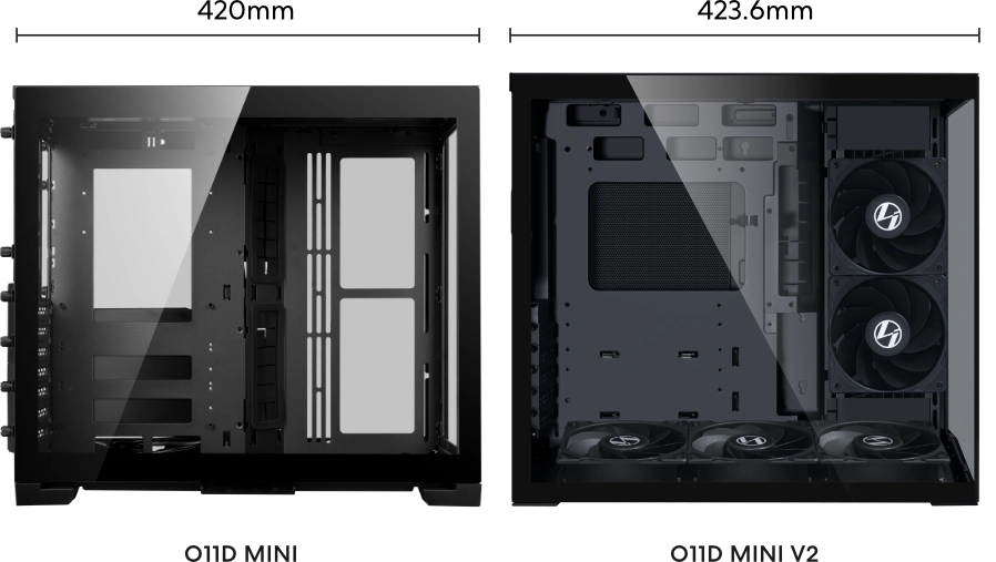 רק 2 ליטר יותר מה-O11D Mini המקורי, אך בעיצוב מחדש המאפשר תאימות רחבה יותר לרכיבים וזרימת אוויר משופרת.