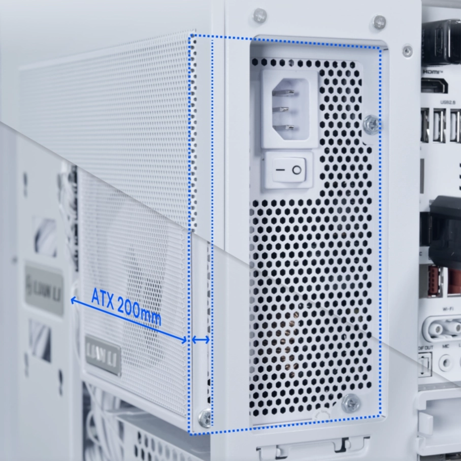 עיצוב רשת צד מורחב מאפשר התקנת ספקי כוח ATX באורך של עד 200 מ״מ – ללא הגדלת רוחב המארז.