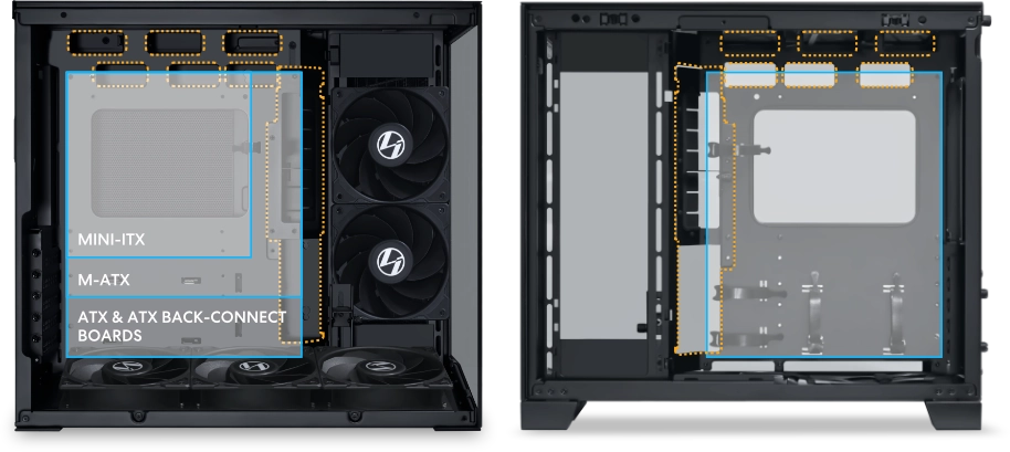 המארז מספק תמיכה רחבה בלוחות אם מסוג ATX, M-ATX ו-Mini-ITX. עבור מי שמחפשים ניהול כבלים מתקדם ובנייה נקייה במיוחד – תאימות Back-Connect זמינה באופן בלעדי עם לוחות אם מסוג ATX Back-Connect.