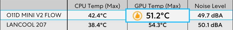 העיצוב המשופע והמאווררים המותקנים מראש מנתבים את זרימת האוויר ישירות אל ה-GPU ומשפרים את יעילות הקירור. בבדיקות תרמיות תחת אותם תנאי רעש, ה-O11D MINI V2 FLOW סיפק שיפור משמעותי בטמפרטורות ה-GPU עם יתרון של 3.1°C לעומת LANCOOL 207, כלומר כ-6% ביצועי קירור טובים יותר ל-GPU.