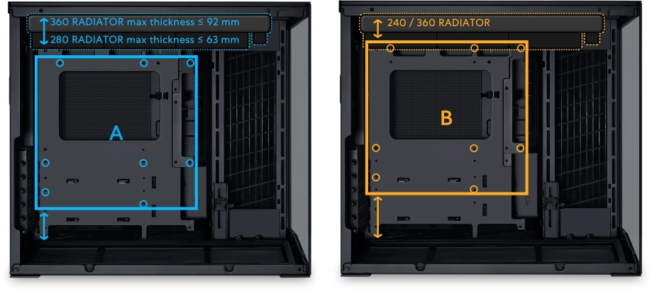המארז כולל סטנדאופים ניתנים להזזה, המאפשרים התאמה אנכית של מיקום התקנת לוח m-ATX. גמישות זו משפרת תאימות לרדיאטורים בגודל 280 מ״מ, וכן לדגמים עבים יותר של 360 מ״מ או 240 מ״מ.