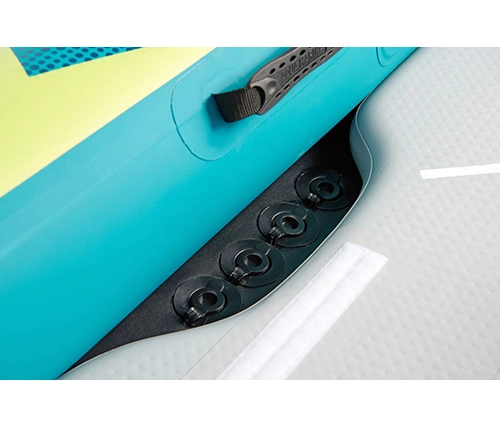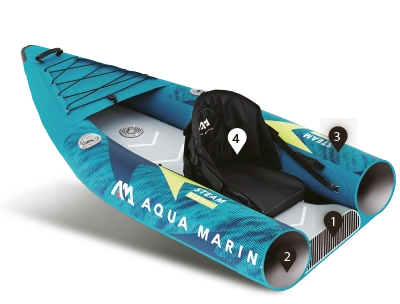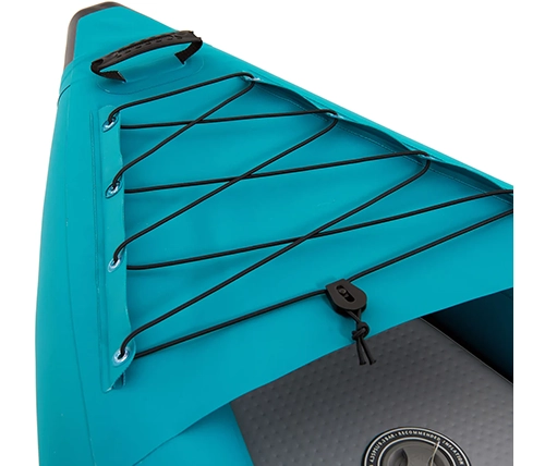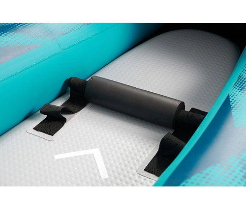 הקיאק עשוי מחומרים עמידים במיוחד, עם רצפת Drop‑Stitch קשיחה המעניקה יציבות גבוהה, מושבים מתנפחים עם משענות גב גבוהות ומשענות רגליים מתכווננות לנוחות ותמיכה מקסימלית.