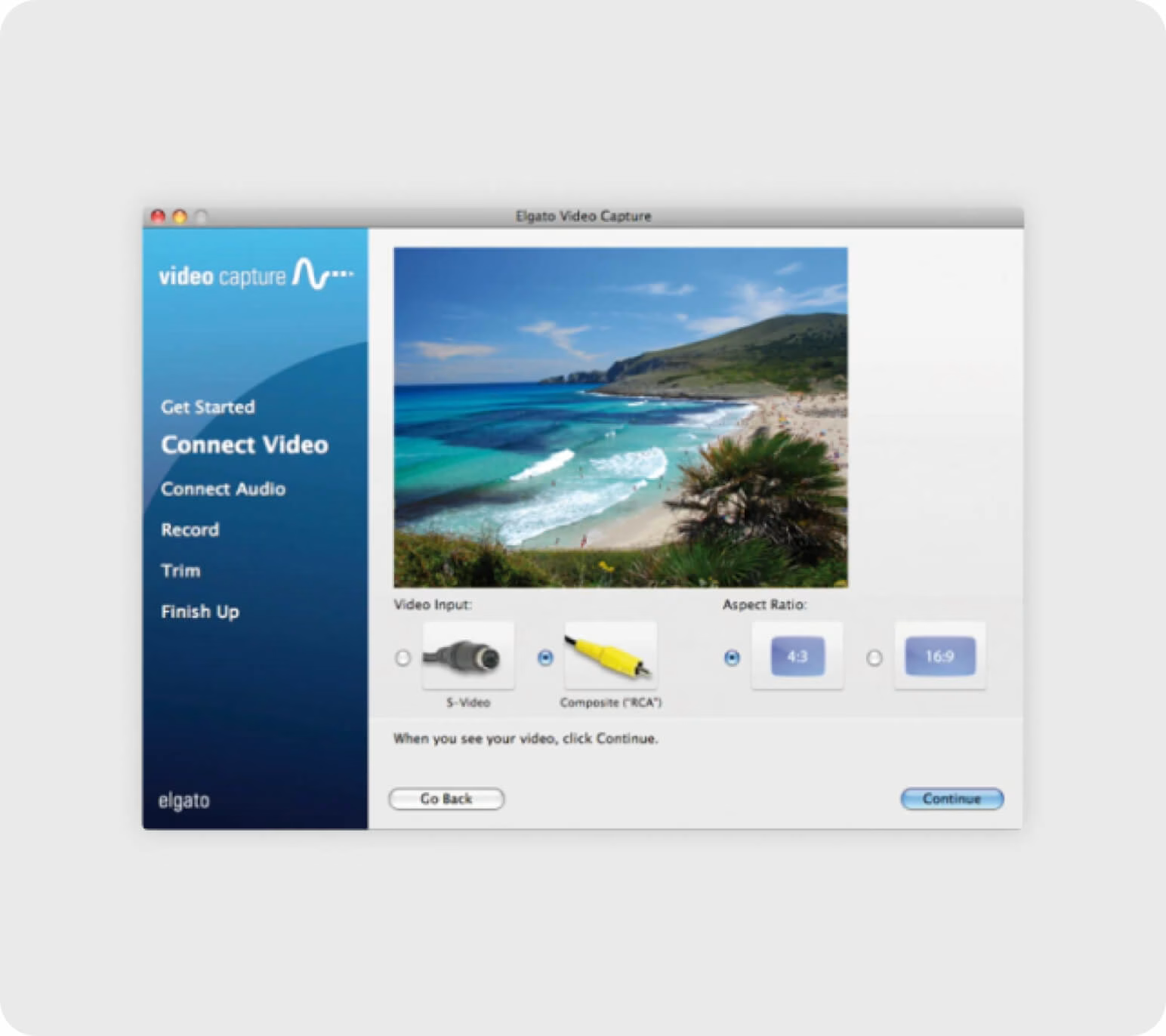 העבירו וידאו ל־Mac או ל־PC מ־VCR, DVR, מצלמת וידאו או כל מכשיר וידאו אנלוגי אחר כקובץ H.264 באיכות גבוהה. התוכנה הידידותית של Elgato Video Capture מדריכה אתכם בכל שלב – מהחיבור של מכשיר הווידאו האנלוגי ועד ללכידת הווידאו ובחירת דרך הצפייה והשיתוף.