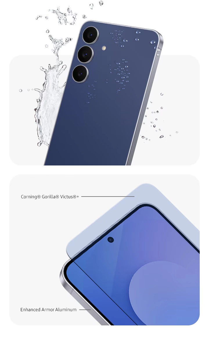 עטוף ב-Corning® Gorilla® Glass Victus®+ ומסגרת אלומיניום Armor משופרת, ה-Galaxy S25 FE עשוי מחומר עמיד ואיכותי יש לו גם דירוג IP68 לעמידות באבק ובמים, כך שאתם יכולים לצאת להרפתקה הבאה שלכם בראש שקט.6