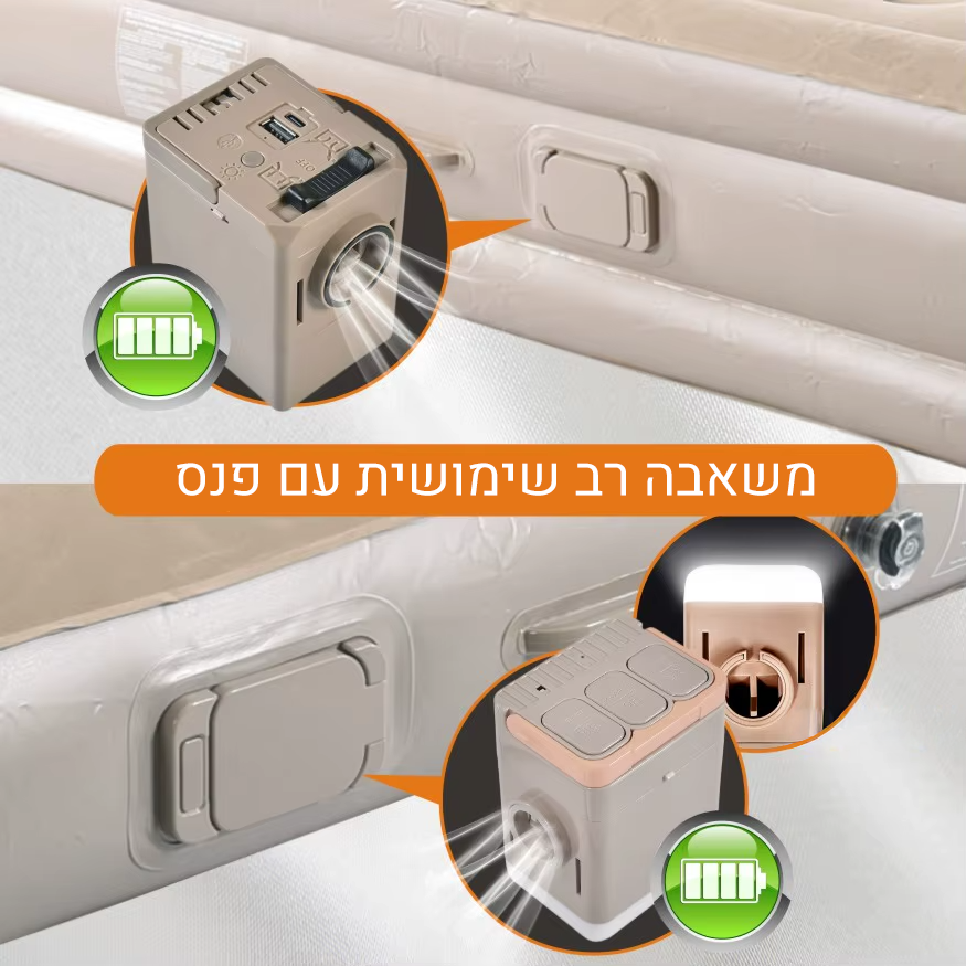 המשאבה הנטענת המצורפת מאפשרת ניפוח מהיר וקל, וגם ריקון מלא תוך דקות. בנוסף, משולב בה פנס עוצמתי המתאים ללילה בשטח, בחדר חשוך או למצבי חירום – הכל בכלי אחד קטן ויעיל.