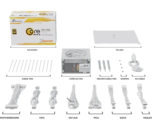 ספק כוח למחשב מודולרי Seasonic CORE GX White ATX 3.1 – הספק 750W – נצילות Cybenetics Platinum – צבע לבן