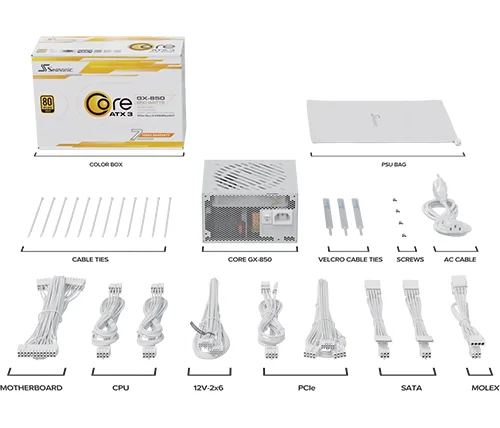 ספק כוח למחשב מודולרי Seasonic CORE GX White ATX 3.1 – הספק 850W – נצילות Cybenetics Platinum – צבע לבן