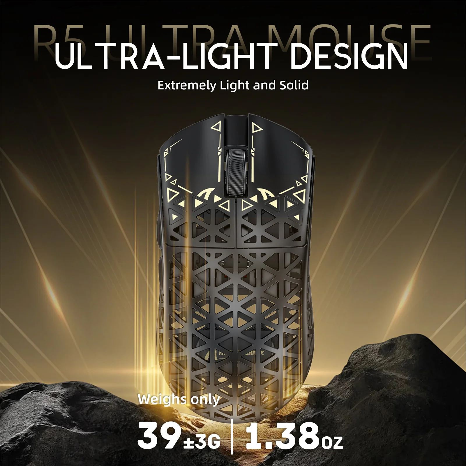 בזכות סיבי הפחמן ועיצוב המעטפת המחוררת, עכבר ה-R5 Ultra קל במיוחד ומשקלו עומד על 39 גרם בלבד (±3). זה קל ב‑33% מה-G Pro X ו‑23% מה-V3 Pro. מושלם לכל סוגי המשחקים המהירים, כולל RPG, MMO, FPS, MOBA ו-Battle Royale.