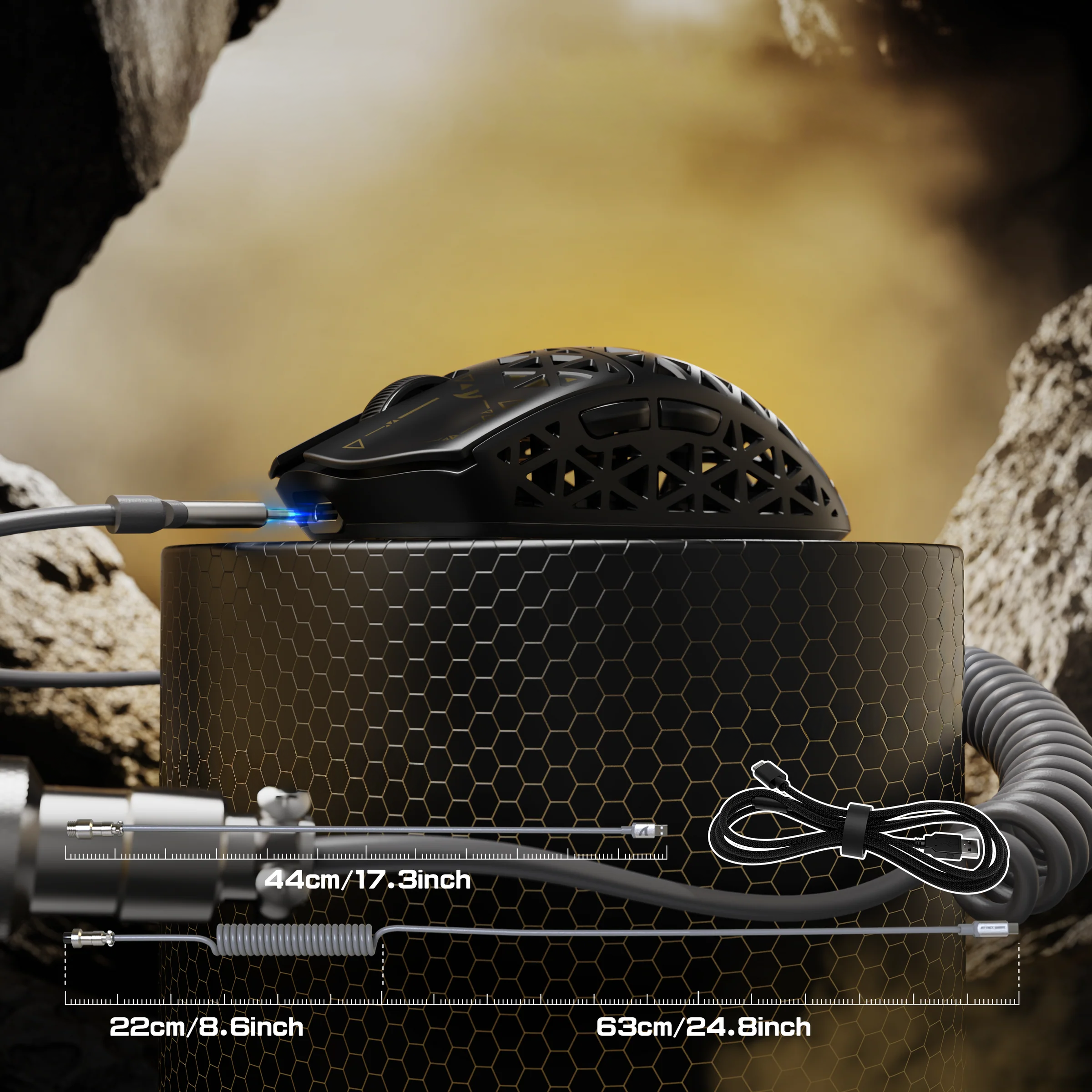 הערכה כוללת כבל מצנח באורך 1.6 מ׳ וכבל סלילי לעכבר, הנמתח עד 70 אינץ׳. עם מחברים ממתכת איכותיים, הכבל עמיד בפני חמצון והפרעות, ומבטיח חיבור יציב ואמין גם בשימוש תדיר ואינטנסיבי.
