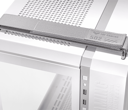 ה-TUF Gaming GT502 PLUS ממשיך את אופטימיזציית הבנייה עם לוחות צד הניתנים להסרה בקלות באמצעות לחיצה על כפתור מוסתר בגב השלדה.
