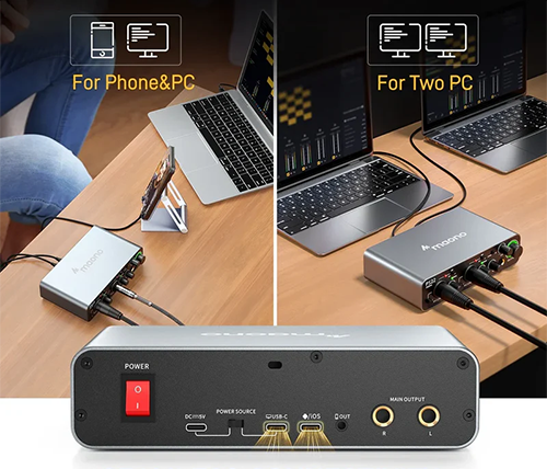 שני חיבורי USB-C מאפשרים חיבור סימולטני למחשב ולסמארטפון או טאבלט – פתרון מושלם לסטרימרים וליוצרי תוכן. בנוסף, תוכנת הניתוב המתקדמת כוללת פונקציית Loopback, המאפשרת הקלטה או שידור של סאונד המחשב והמיקרופון יחד או בנפרד.