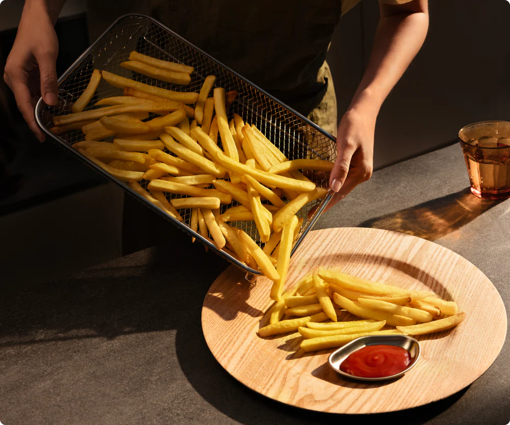 מספק את אותן תוצאות פריכות כמו איירפריי מסורתי — אך עם משטח רחב יותר לצלייה אחידה. תהנו ממרקם זהוב ופריכות מספקת עם עד 80% פחות שמן* מאשר טיגון עמוק.