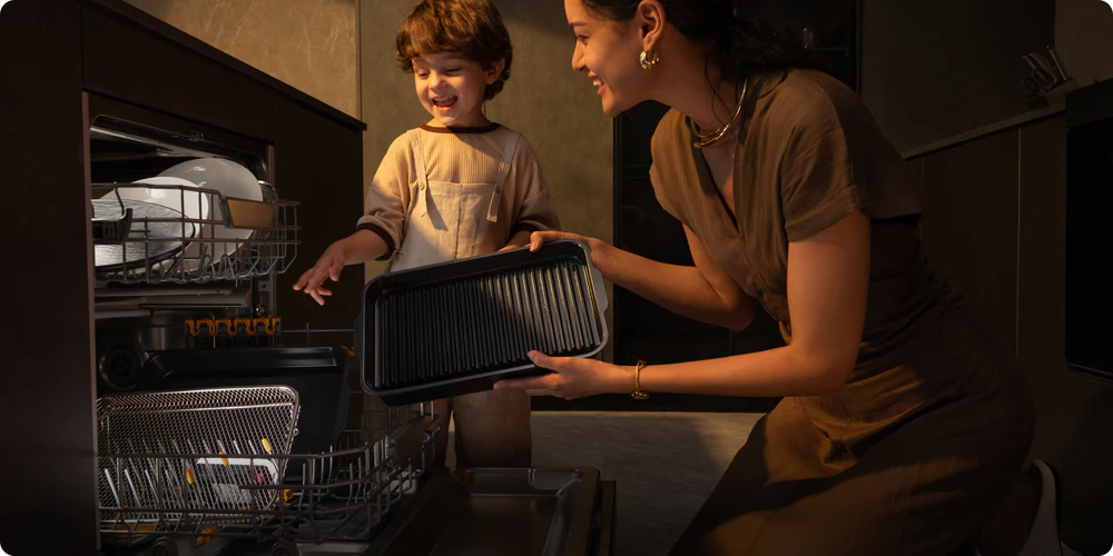 הניקוי קל עם מכסה נשלף שנשטף בקלות בתוך שניות. כל האביזרים* מצופים בציפוי נונסטיק ללא PTFE/PFOA וניתנים לניקוי במדיח כלים לנוחות מקסימלית.