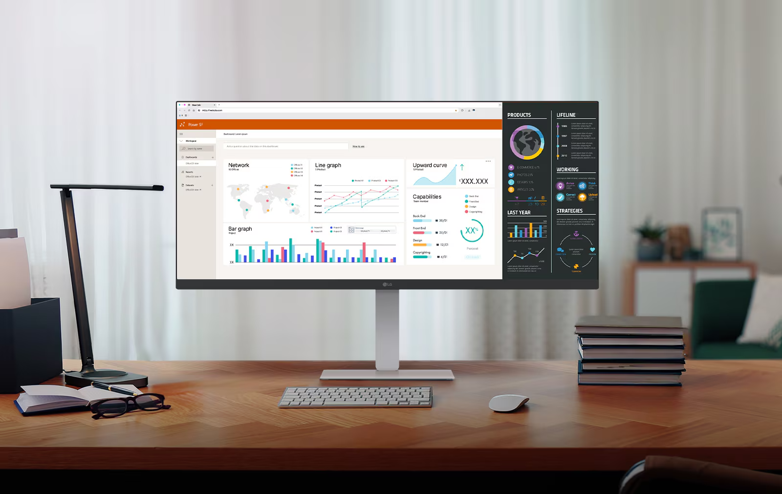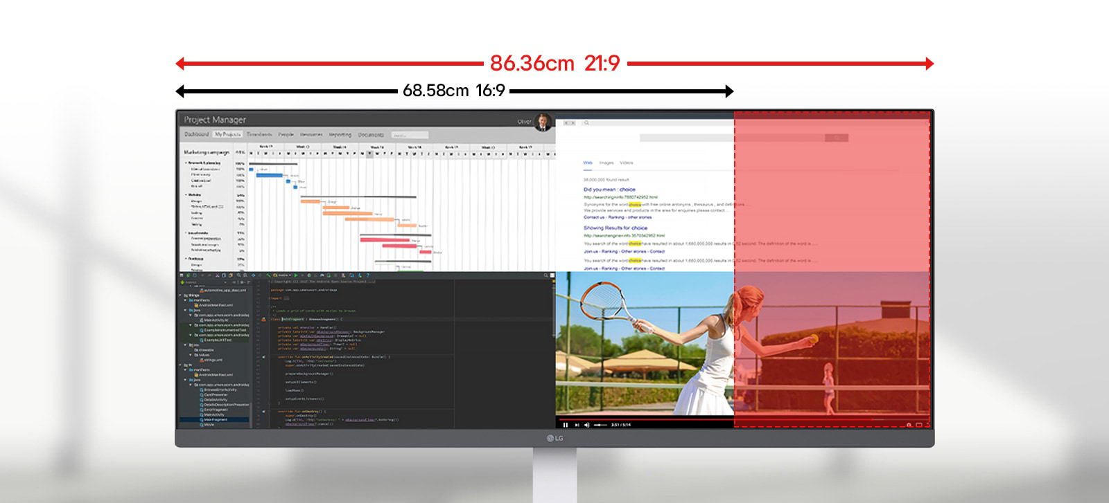 תצוגת UltraWide™ Full HD (2560×1080) מספקת לכם יותר שטח מסך אופקי בהשוואה למסך FHD רגיל (1920×1080). העיצוב הכמעט נטול מסגרת מעניק לכם תצוגה רציפה ורחבה יותר, ומאפשר עבודה יעילה יותר עם כמה משימות במקביל – בלי לעבור בין חלונות כל הזמן.