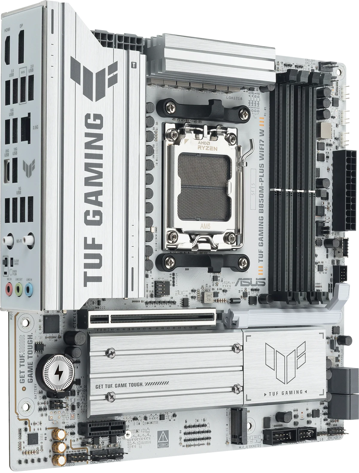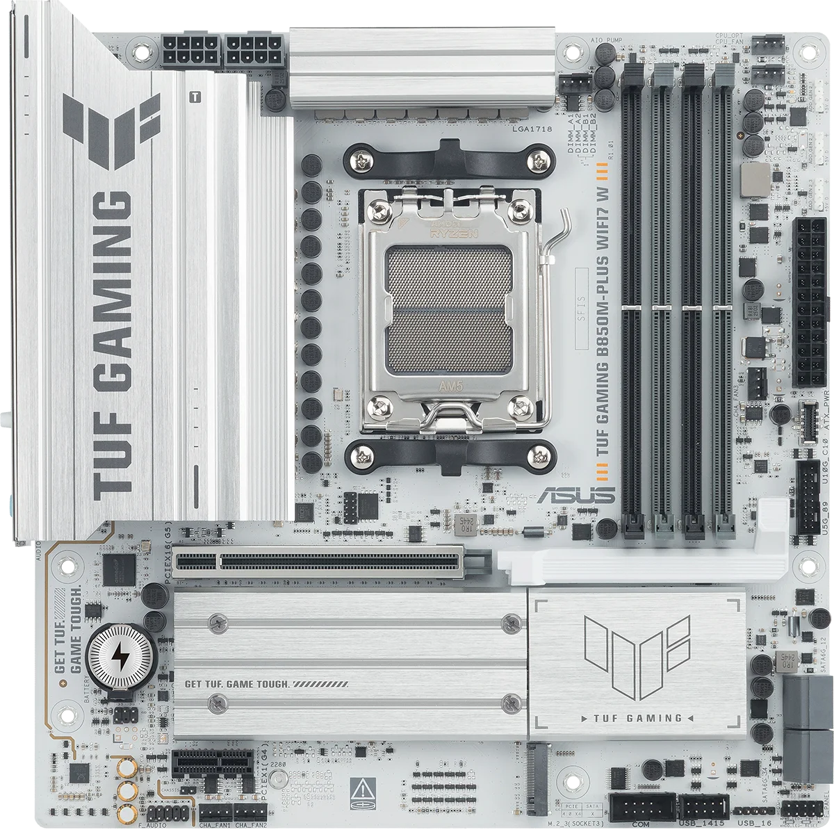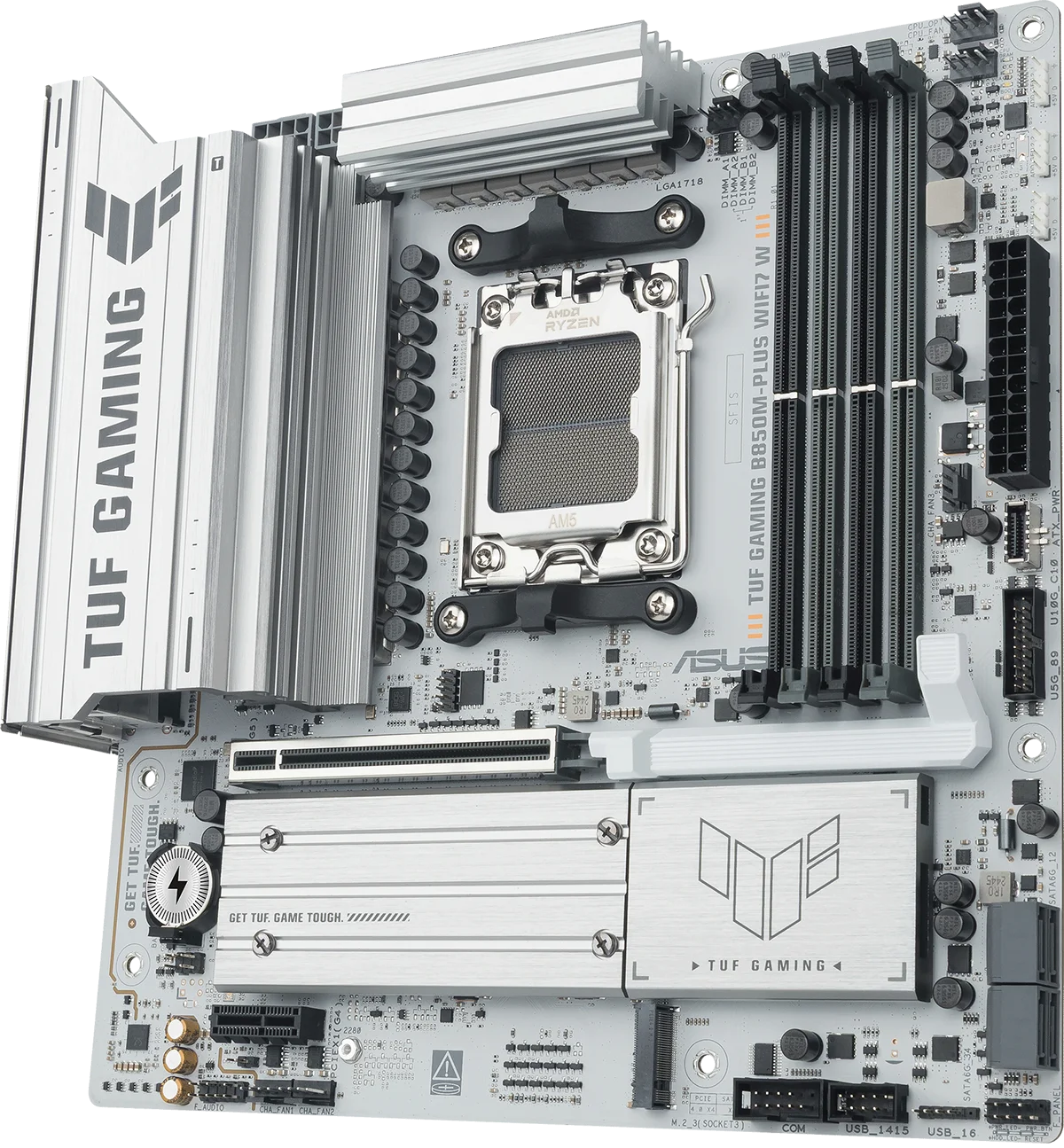 לוח האם ASUS TUF GAMING B850M-PLUS WIFI7 W משלב את כל המרכיבים החיוניים של מעבדי AMD Ryzen™ מהדור החדש עם תכונות מוכנות לגיימינג ועמידות מוכחת. הלוח מתוכנן עם רכיבים בדרגת תקן צבאי, מערך אספקת חשמל משודרג ומערכת קירור מקיפה – כך שאתם מקבלים ביצועים יציבים וחזקים, גם בסשנים ארוכים של גיימינג אינטנסיבי.