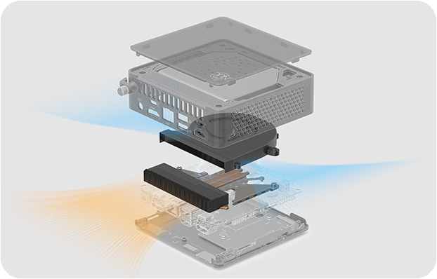 ASUS NUC 15 Pro כולל תכנון תרמי מתקדם עם שני צינורות קירור, ניהול חום חכם ופתחי אוורור במיקום אסטרטגי – כדי להבטיח פיזור חום יעיל ושקט.