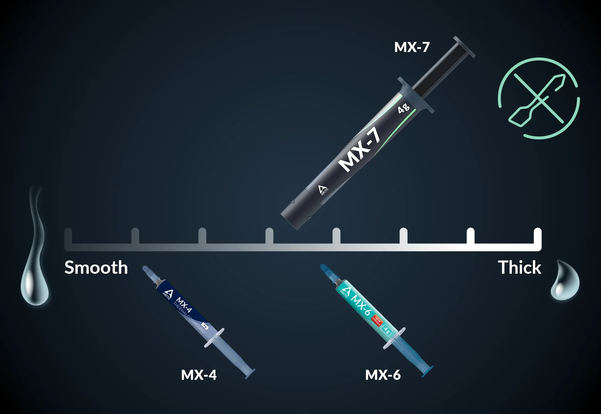ה-MX-7 מתאפיין בעקביות סמיכה ודחוסה הנובעת מתכולת חומר מילוי גבוהה, המספקת ביצועים תרמיים מיטביים. בזכות המרקם הייחודי שלו, לא ניתן למרוח את המשחה באמצעות מרית.
