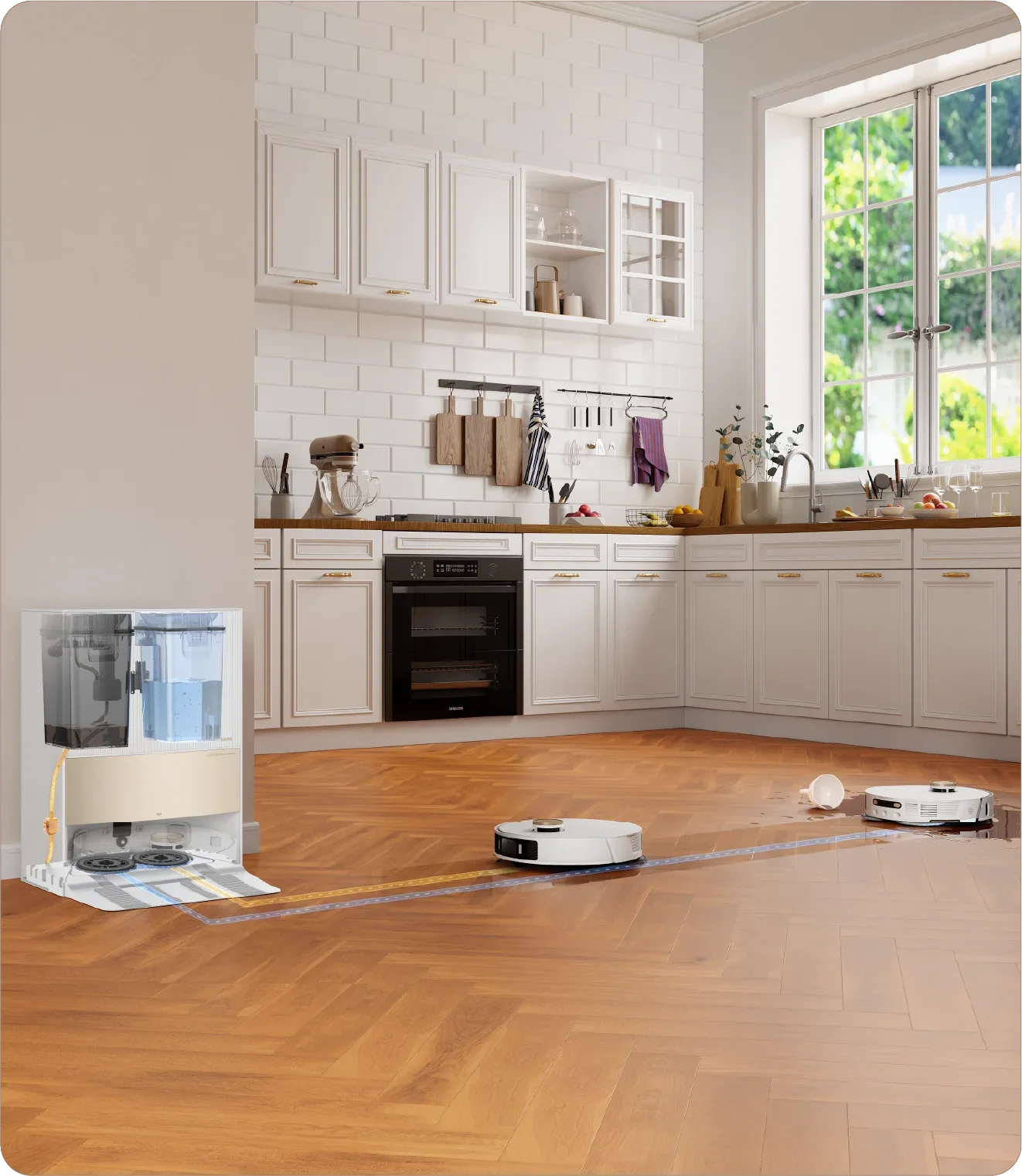 המערכת ממלאת מחדש את מכל המים של הרובוט מתוך מכל מים נקיים בנפח 4.5 ליטר.