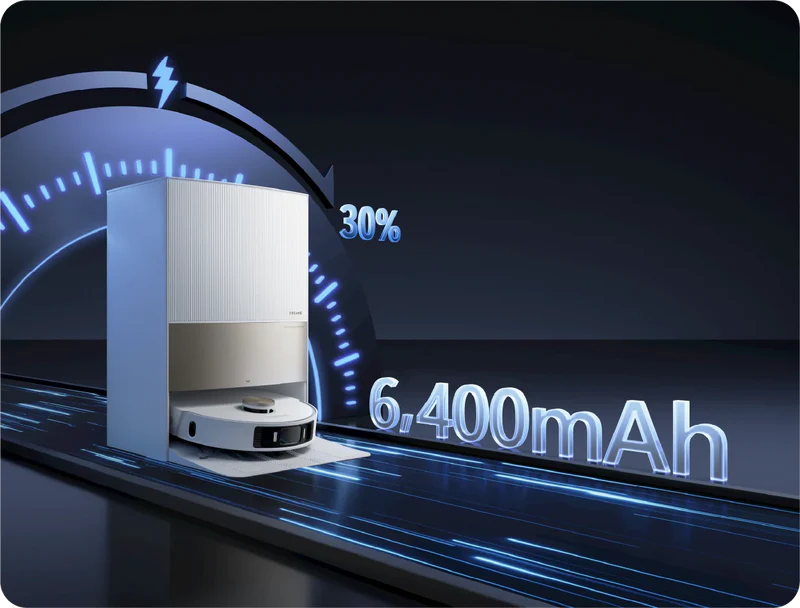 הטכנולוגיה המתקדמת של Dreame מגבירה את מהירות הטעינה באופן עצום עבור הסוללה הגדולה בנפח 6,400mAh, כדי להבטיח שהרובוט שלכם יהיה מוכן במהירות לסבב הניקיון הבא.