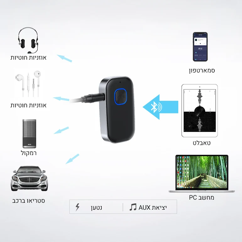 הפתרון האידיאלי לשדרוג רכבים ללא מערכת Bluetooth מובנית, הפיכת רמקולים רגילים לאלחוטיים, או חיבור סמארטפונים מודרניים (ללא שקע אוזניות) לאוזניות חוטיות.