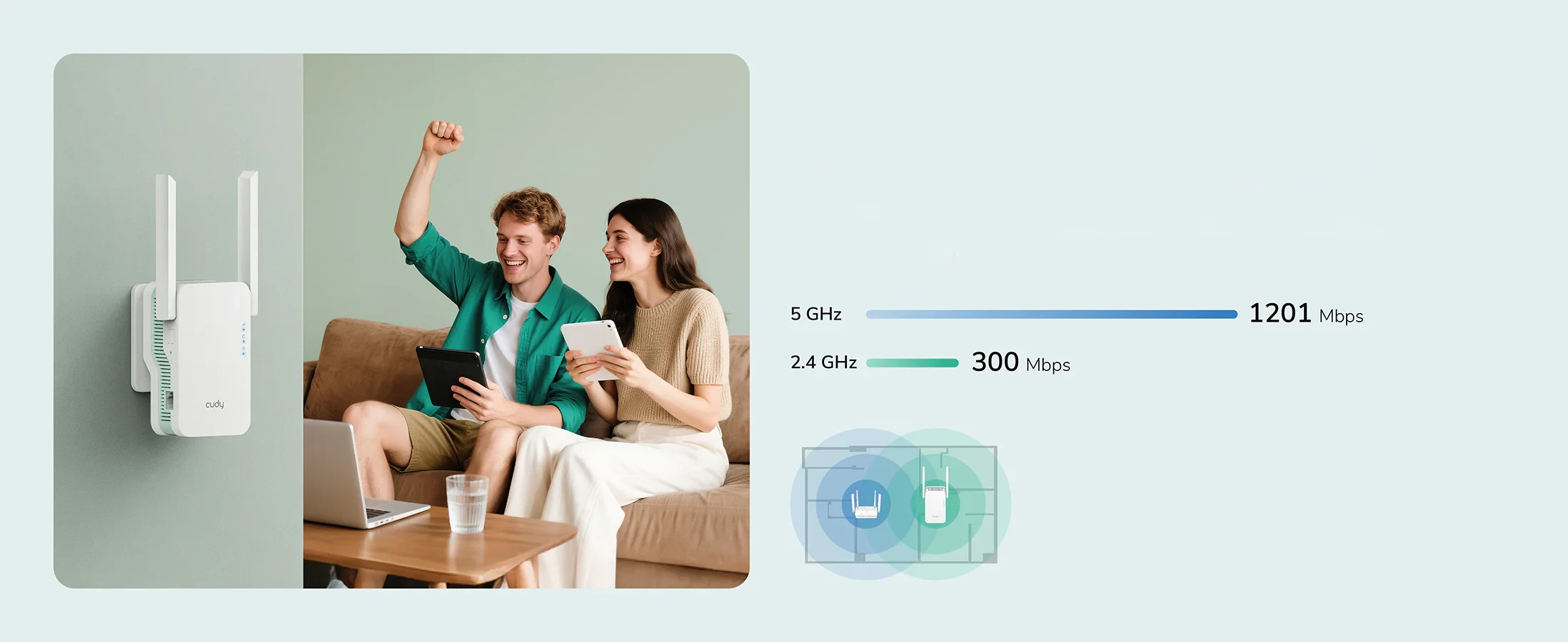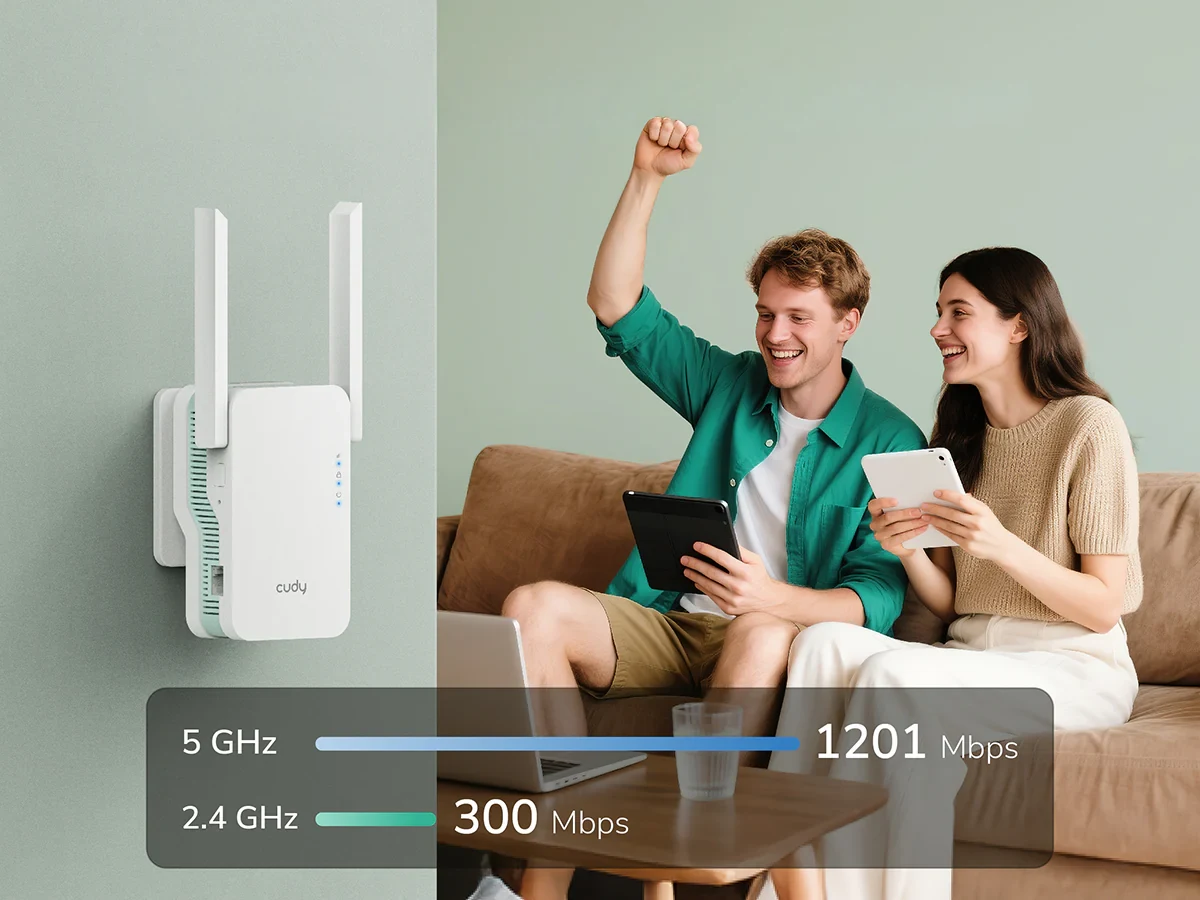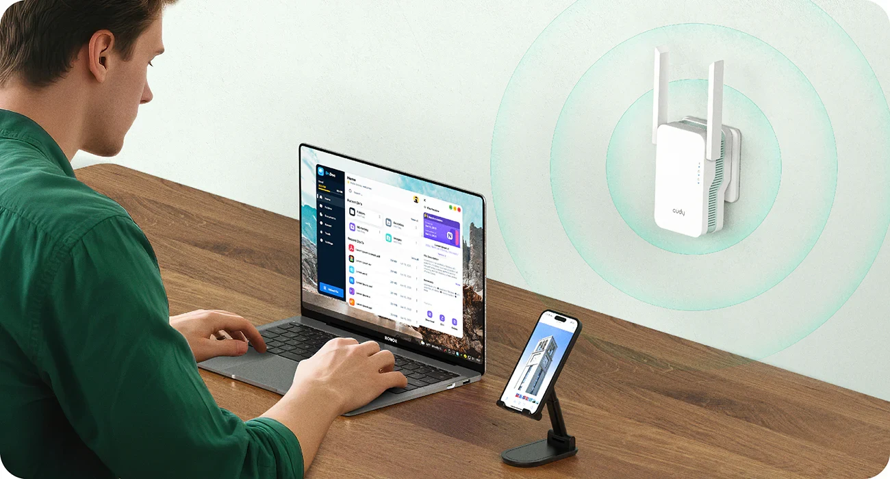 דגם RE1500 תומך בטכנולוגיית Cudy Mesh כדי לאפשר נדידה (Roaming) חלקה בכל רחבי הבית בשילוב עם מכשירי Cudy Mesh נוספים. הדבר מאפשר לכם לעבור בחופשיות בין החדרים ללא צורך בהחלפה ידנית של הרשת.