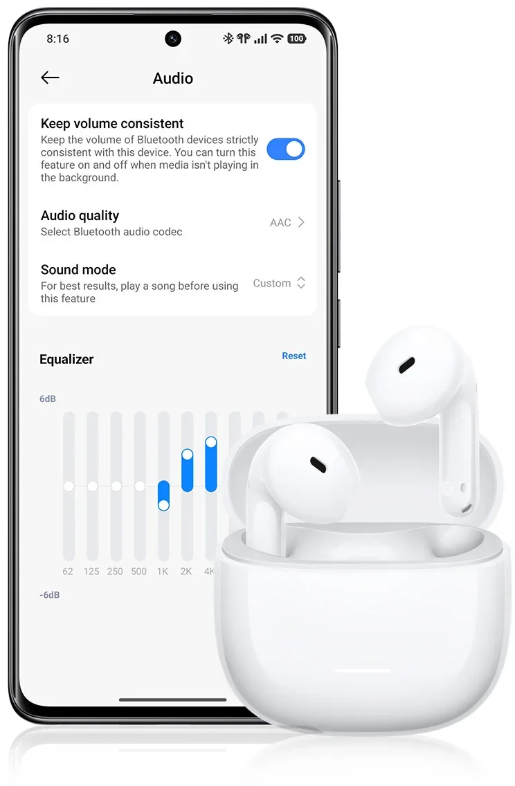נהלו את האוזניות שלכם בקלות באמצעות אפליקציית Xiaomi Earbuds. באמצעות האפליקציה תוכלו להתאים הגדרות EQ ולכוון את חוויית השמע לפי ההעדפות שלכם. בנוסף, האפליקציה תומכת בעדכוני קושחה (Firmware) אונליין לשיפור מתמיד של הביצועים, וכן מאפשרת התאמה אישית של מחוות שליטה – בלחיצה אחת או כפולה – לביצוע הפעולות המועדפות עליכם.