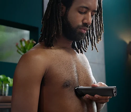 גלחו בנוחות מתחת לקו הצוואר עם אביזר גילוח הגוף שלנו. מערכת הגנה ייחודית לעור שומרת על אזורים רגישים בזמן שאתם מגלחים קרוב עד ל-0.5 מ"מ. ניתן גם לקצץ את שיער הגוף עם מסרק ה-Click-on.