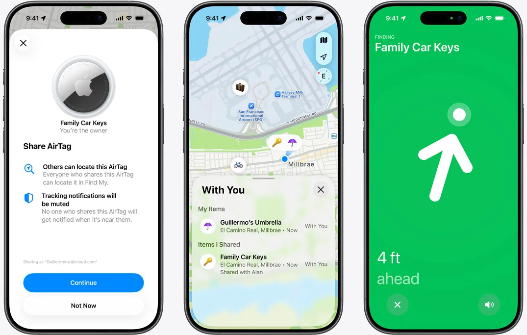 שתפו את ה-AirTag עם עד חמישה אנשים. כך פריטים שכולם משתמשים בהם — כמו מטרייה, אופניים או מפתחות הרכב המשפחתי — ניתנים למעקב על ידי חברים ובני משפחה.