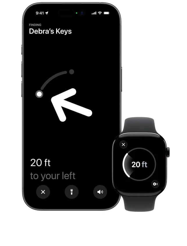 אם ה-AirTag שלכם נמצא בקרבת מקום, ה-iPhone או ה-Apple Watch שלכם יובילו אתכם ישירות אליו. בזכות טווח Precision Finding המורחב¹,² וטכנולוגיית Ultra Wideband המובנית, תראו את המרחק המדויק ואת הכיוון שאליו צריך ללכת — בין אם השארתם אותו על השולחן או ברכב.