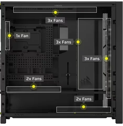 התאימו אישית את מערך הקירור שלכם עם מקום לעד 14 מאווררי 120 מ"מ, לצד אפשרויות התקנה מגוונות לרדיאטורים – כולל עד שלושה רדיאטורי 360 מ"מ בחלק העליון, הקדמי והצדי.