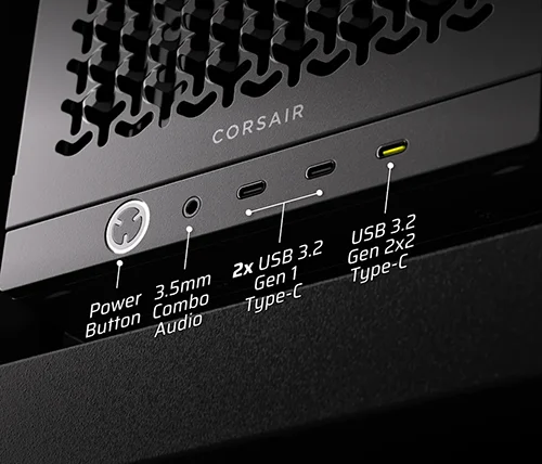 כל החיבורים החשובים נמצאים בהישג יד בחלק הקדמי של המארז, כולל חיבור USB 3.2 Gen2x2 Type-C עם רוחב פס של 20Gb/s, שני חיבורי USB 3.2 Gen1 Type-C עם רוחב פס של 5Gb/s כל אחד, וכן שקע משולב לאוזניות ולמיקרופון.