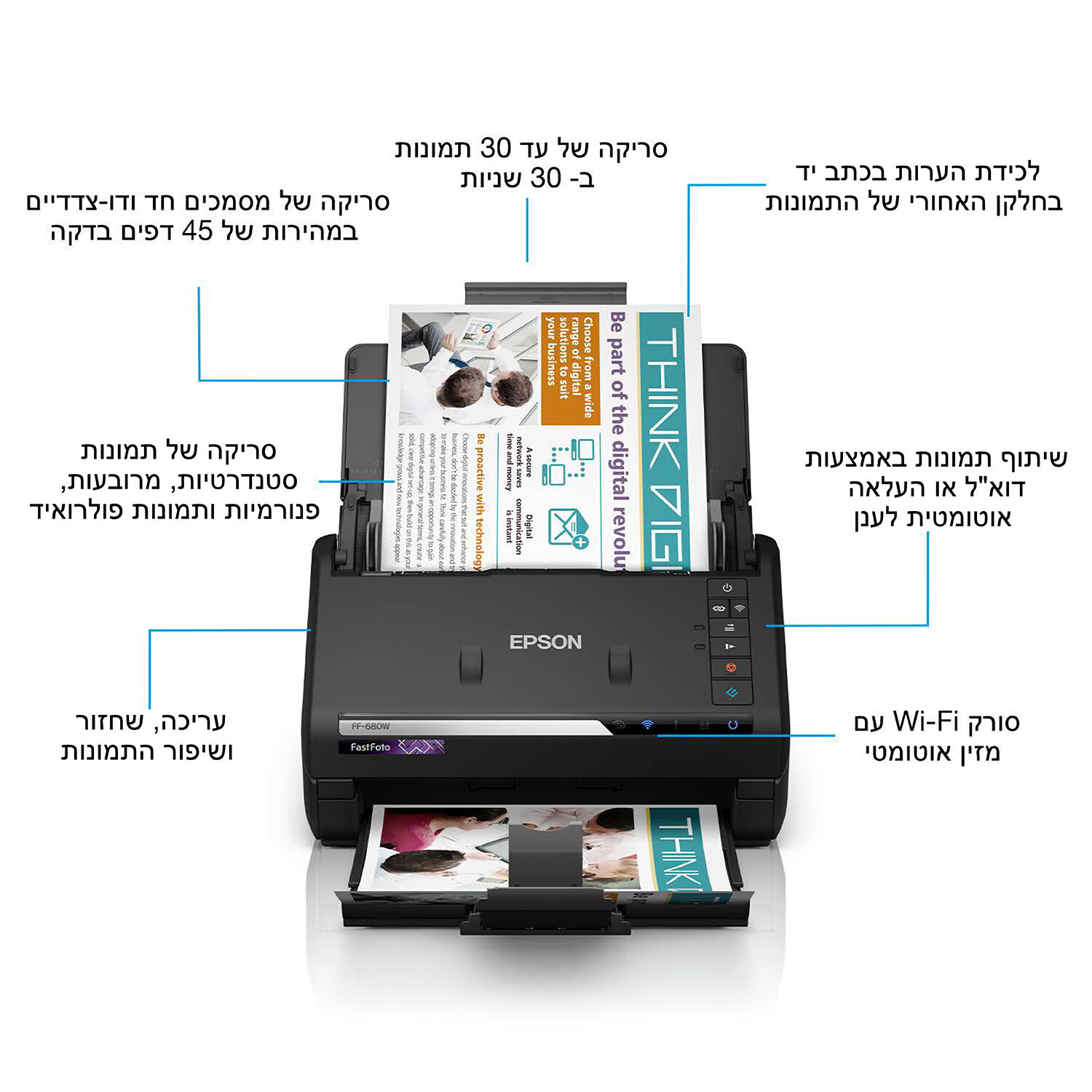 סורק מסמכים ותמונות שולחני מהיר אפסון Epson FastFoto FF-680W עם Wi-Fi ומזין אוטומטי – משלוח חינם
