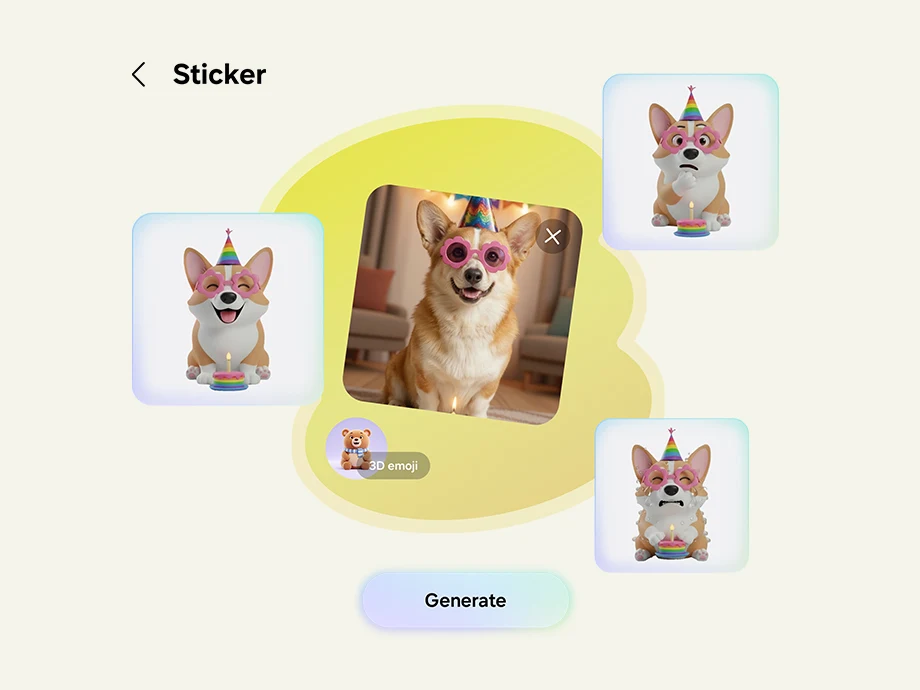פתחו את Creative Studio וגלו מרחב ייעודי ליצירת ערכות סטיקרים. שלבו ציורים או תמונות עם טקסט בהתאם לדמיון שלכם. ספקו תיאור טקסט פשוט או קווי מתאר של סקיצה, ו-Galaxy AI כבר יפיק את היצירות. לאחר מכן תוכלו להוסיף את הערכה למקלדת או לשתף אותה עם חברים.25