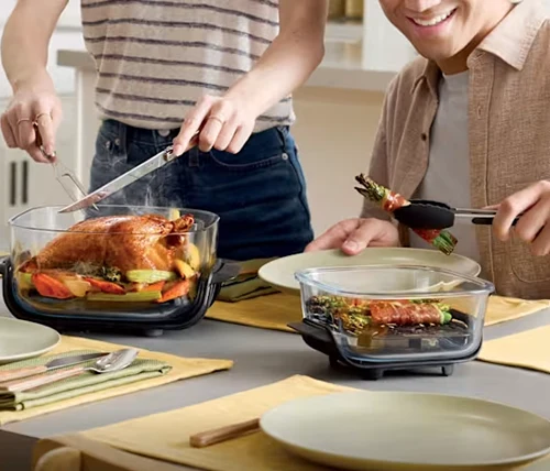 עברו בקלות ממרינדה לבישול או ממשטח העבודה לשולחן האוכל, והכול במערכת בישול מזכוכית אחת חלקה.