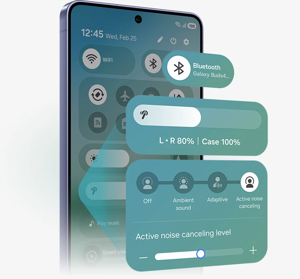 ה-One UI 8.5 המשודרג יוצר חיבור עמוק בין אוזניות ה-Galaxy Buds לסמארטפון Galaxy, כמעט כמו דואט. השליטה אינטואיטיבית יותר מאי פעם – אתם יכולים לנהל תכונות מהגדרות המכשיר, בלי להוריד אפליקציה נפרדת. מלוח ההגדרות המהירות, אפשר לגשת בקלות לתכונות, וגם להגדיר ולשמור העדפות שמע לכל אפליקציה.1,18,19
