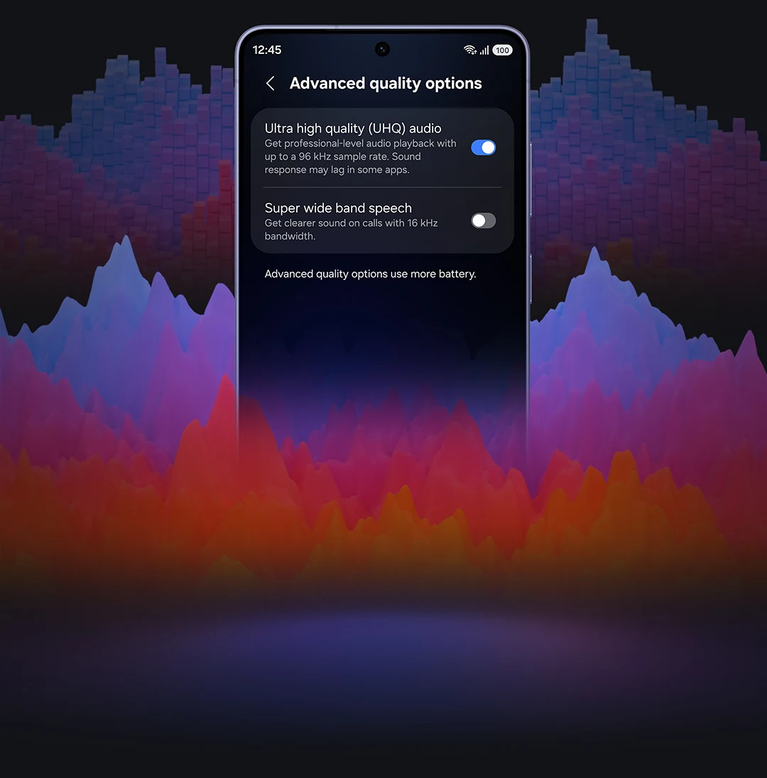 שומעים איך כל שכבה מתעוררת לחיים עם עומק סיבית מורחב וקצבי דגימה גבוהים. Samsung Seamless Codec (SSC) תומך בשמע של 24-bit / 96 kHz ושומר על הצליל המקורי עם כמות עצומה של מידע. בנוסף, בקרת העברת נתונים אופטימלית מאפשרת חוויית האזנה יציבה עם פחות רעשי לוואי או שיבושים בשמע. הפעילו את האפשרות שמע באיכות גבוהה במיוחד (UHQ) בסמארטפון Galaxy שלכם, וגלו מחדש את השירים האהובים עליכם באיכות מלאה.1,8,9