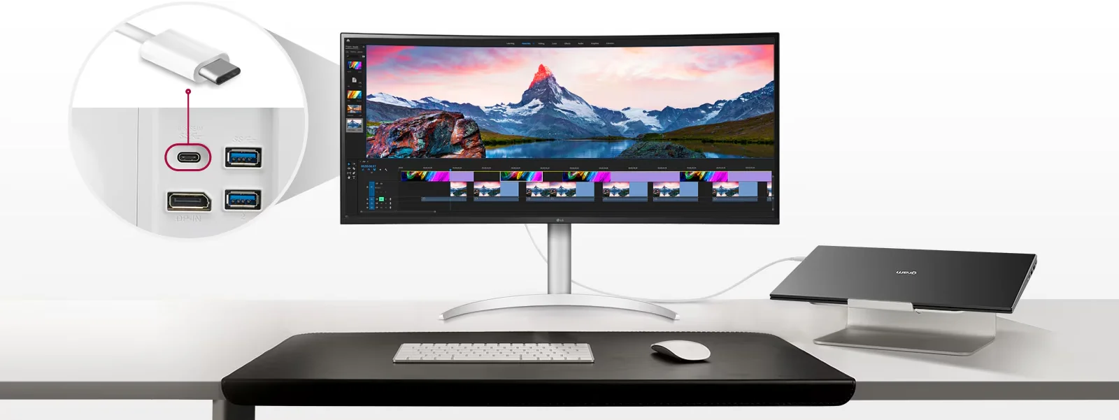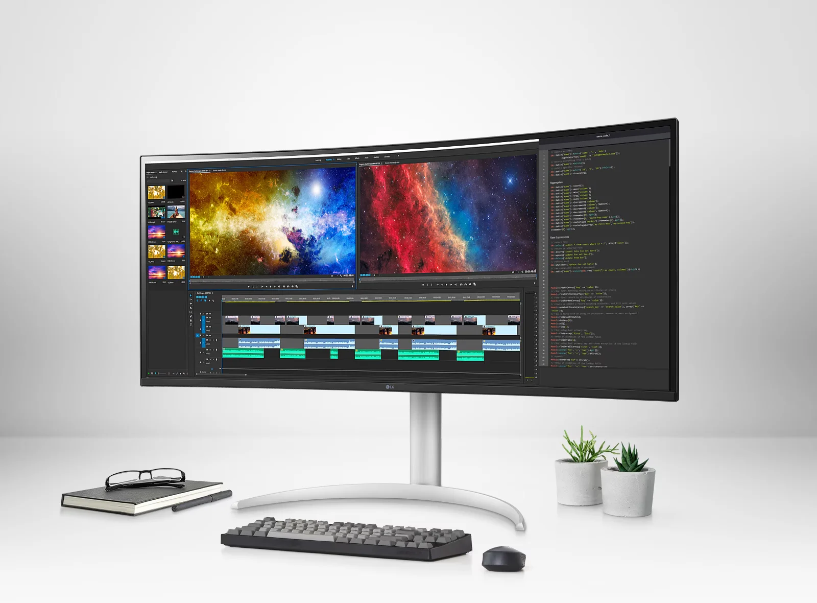 מסך UltraWide™ QHD (רזולוציה של 3840x1600, יחס גובה-רוחב של 21:9) הוא כלי עבודה מצוין. הוא מאפשר להתמודד עם חומרי צילום בעת עריכת וידאו וניתן להציג את תוספי השמע והאפקטים בו-זמנית.