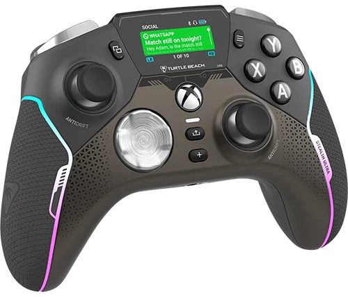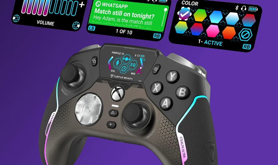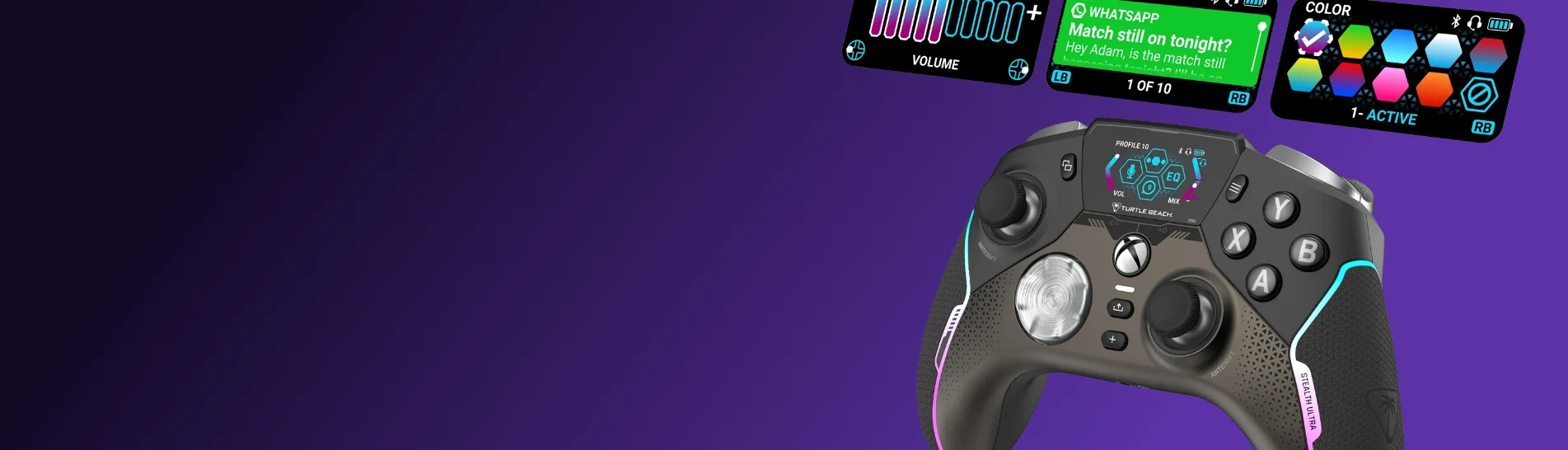 מערכת תצוגה דינמית בצבע מלא מציגה התראות חברתיות ומאפשרת שליטה נוחה במגוון הגדרות ישירות מהבקר. ניתן למצות את מלוא היכולות של Stealth Ultra ולשמור עד 10 פרופילים שונים עם התאמה אישית של מיפוי כפתורים, אזורי תגובה, רגישות צירים, עוצמת רטט, שיפורי שמע ותאורת RGB.