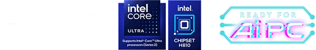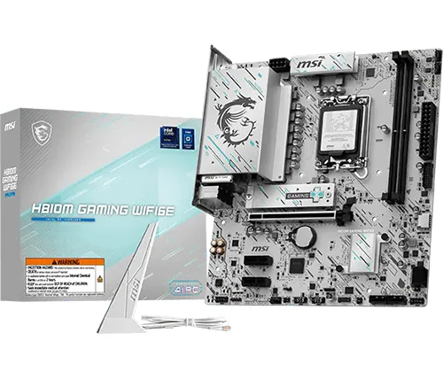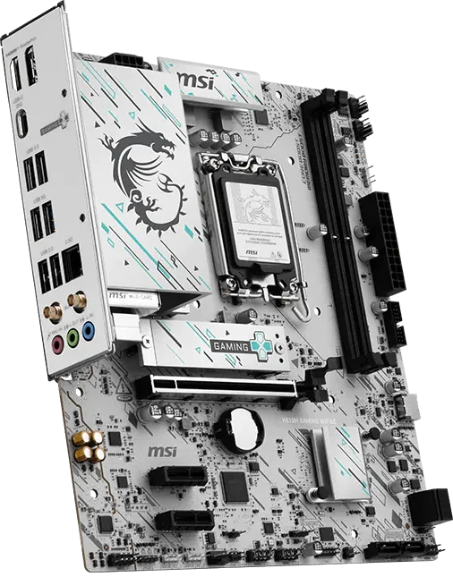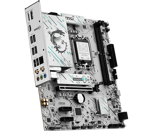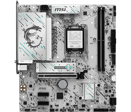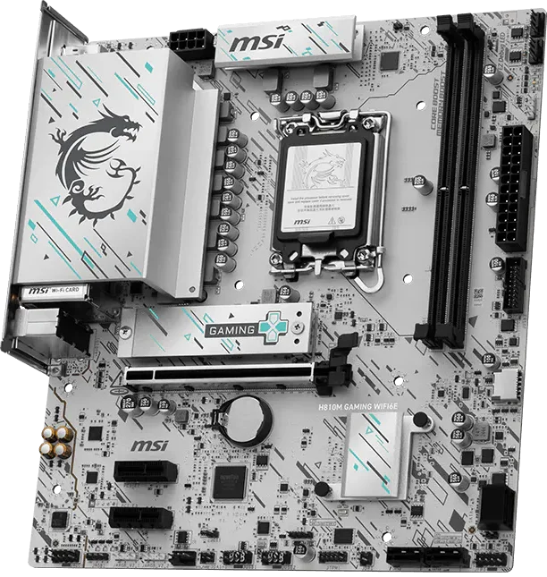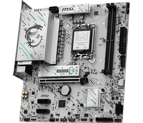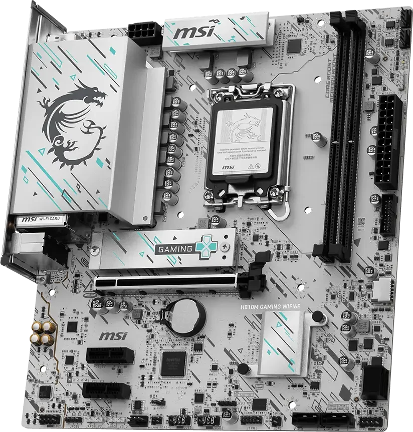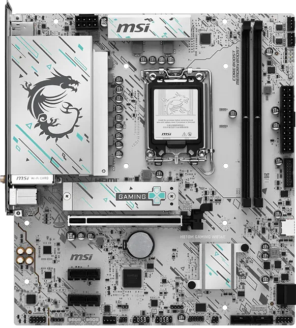 לוח האם H810M GAMING WIFI6E מציג עיצוב אלגנטי בהשראת סייבר, עם דוגמה גאומטרית בגווני טורקיז ושחור על בסיס כסוף. הוא כולל חיבור USB 20G Type-C, תמיכה ב-Wi-Fi 6E, רשת 2.5G, פתרון PCIe 5.0 ומערכת קירור M.2 Shield Frozr, ומוכן למעבדי Intel Core Ultra.