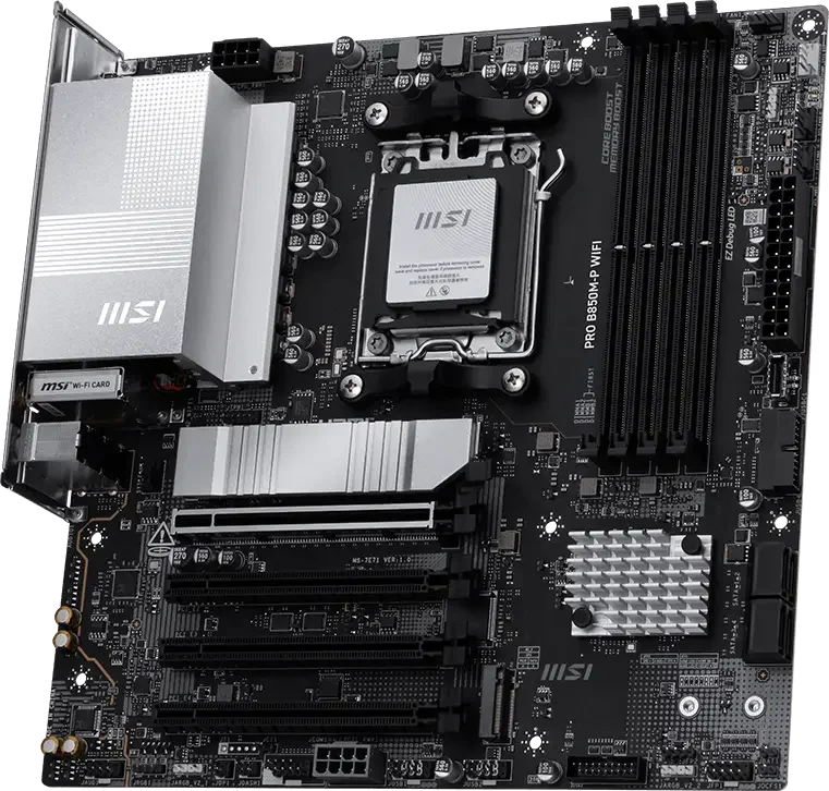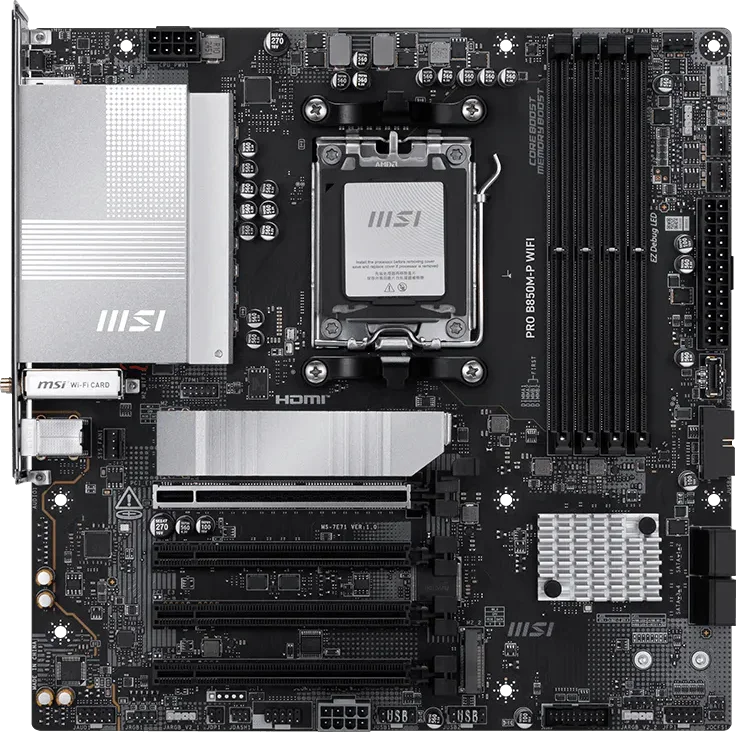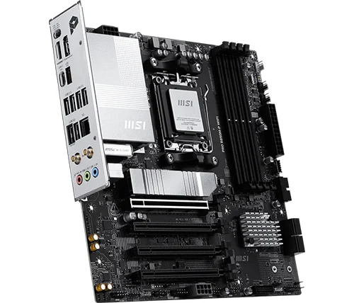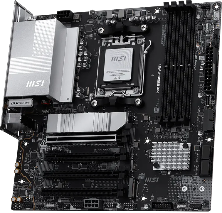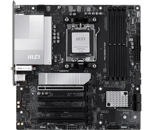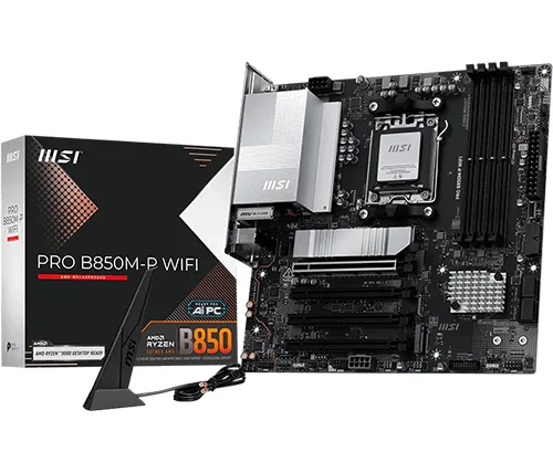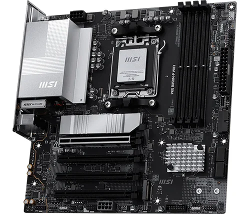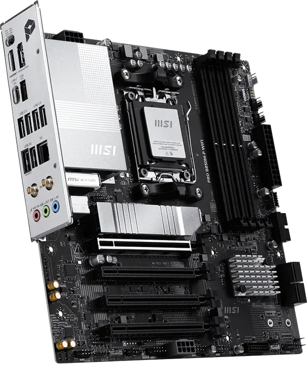 לוח האם PRO B850M-P WIFI מציע עיצוב נקי עם סכמת צבעים כסופה הרמונית, המשתלבת בצורה מושלמת עם מערכות מחשב בצבע לבן או שחור. הוא כולל מגוון פיצ'רים ייחודיים של MSI, כגון Wi-Fi 7 עם אנטנת EZ, רשת 5G, תמיכה ב-PCIe 5.0 ל־M.2 עם קירור EZ M.2 Shield Frozr II, וחיבור מתח משלים ל־PCIe. הלוח מוכן לעבודה עם מעבדי AMD Ryzen™ מסדרה 9000.