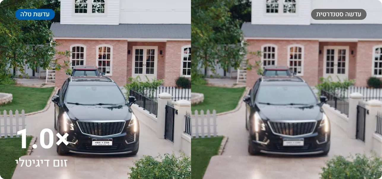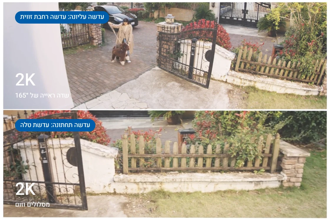 עקוב אחר שני אזורים נפרדים במקביל באמצעות מצלמה אחת עוצמתית. צמצם נקודות עיוורות וקבל תמונת מצב מקיפה ומלאה יותר של הבית.