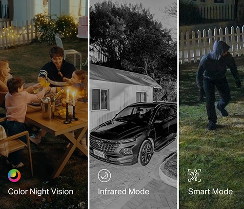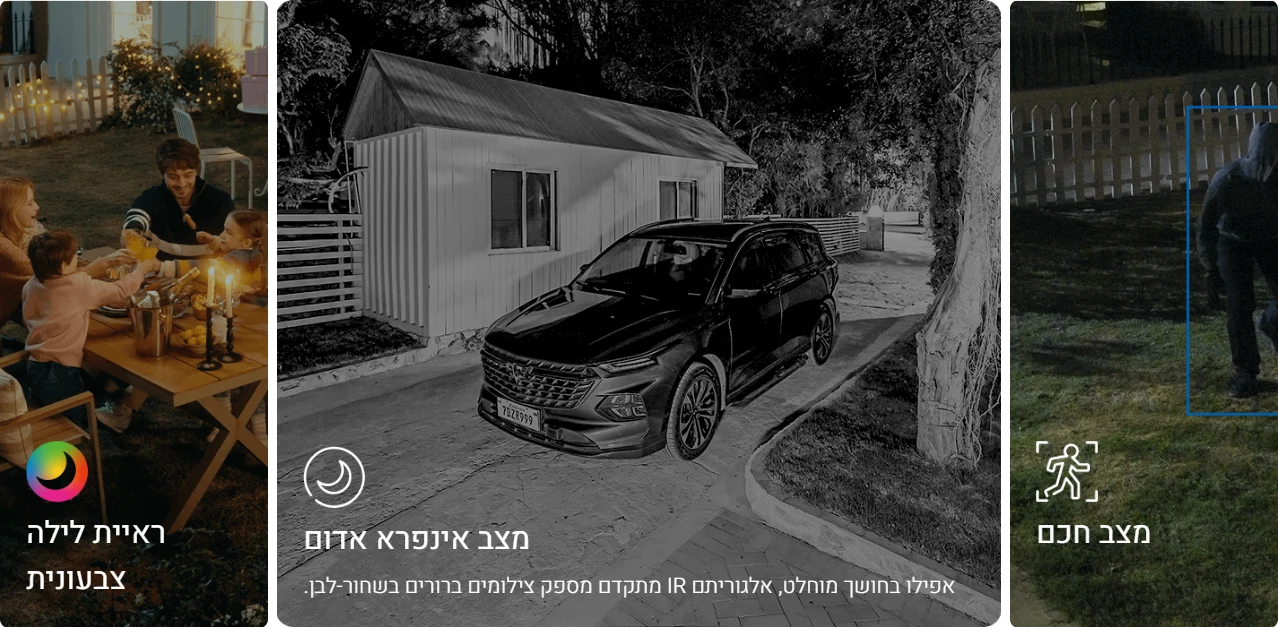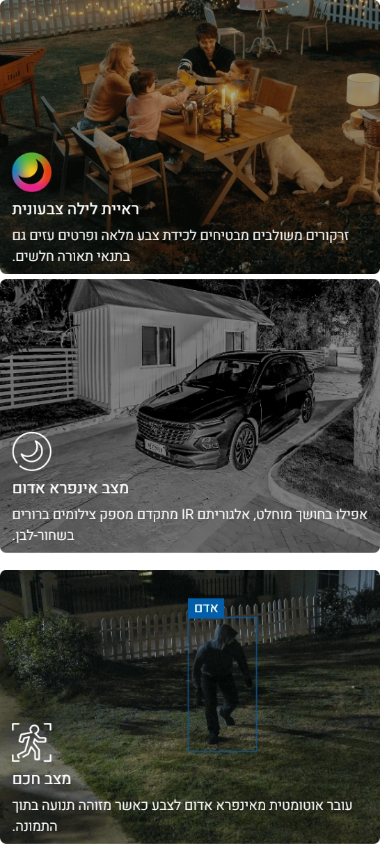 בחר בין תמונה צבעונית מלאה עם תאורת ספוט, ראיית אינפרה־אדום שחור־לבן דיסקרטית, או מצב חכם אוטומטי המבוסס על זיהוי תאורה באמצעות AI, לקבלת בהירות אופטימלית בכל תרחיש לילה.