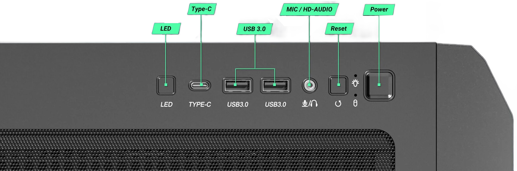 כפתור הפעלה, כפתור איפוס, כפתור שליטה בתאורה, 2 חיבורי USB 5Gbps, חיבור Type-C 10Gbps, חיבורי אודיו/מיקרופון