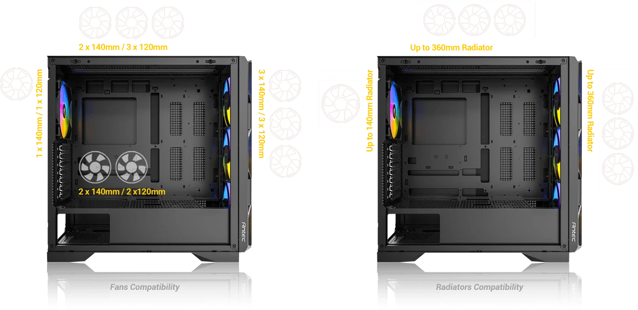 ה-AX1000 ARGB מציג עיצוב קדמי גאומטרי אלגנטי בשילוב פאנל צד מזכוכית מחוסמת בתצוגה מלאה, המאפשר לכם להציג את מערכת הגיימינג שלכם ללא הפרעות.