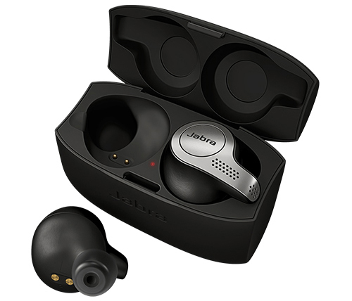 אוזניות אלחוטיות Jabra Elite 65T עם מיקרופון Bluetooth בצבע שחור כסוף הכוללות כיסוי טעינה