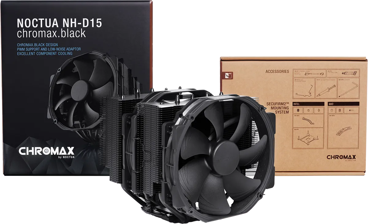 מאוורר למעבד Noctua דגם NH-D15 chromax.black הכולל 2 מאווררים בגודל 14 ס"מ בצבע שחור המתאים למגוון תושבות Intel ו-AMD