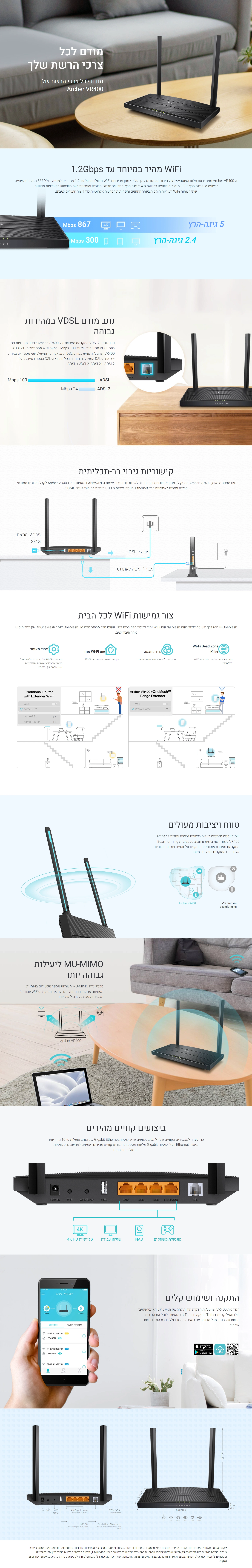 ראוטר מודם TP-Link Archer VR400 V3 WIFI 5 AC1200 Wireless MU-MIMO VDSL/ADSL