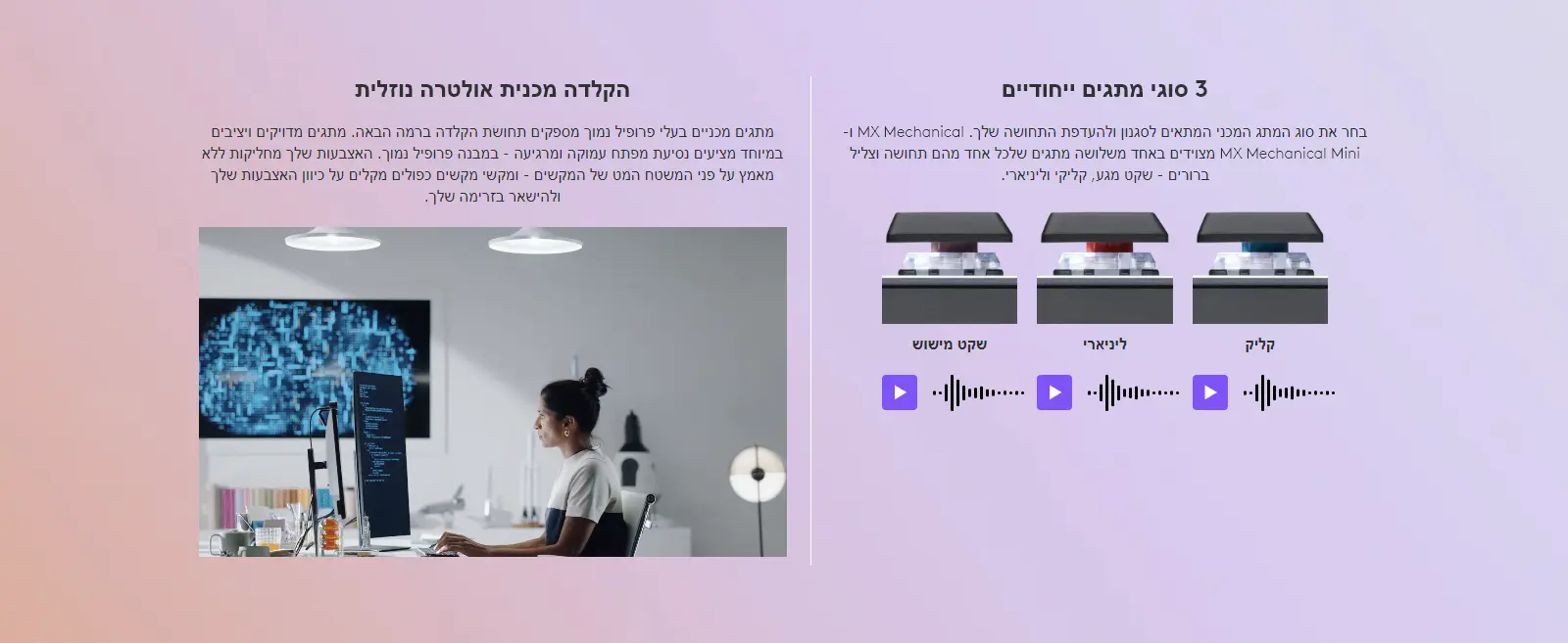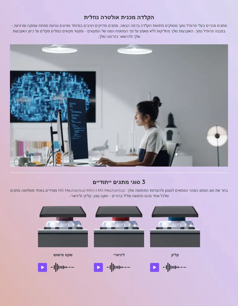 הכירו את MX Mechanical & MX Mechanical Mini - מקלדות עם מתגים מכניים בפרופיל נמוך ותאורה חכמה לדיוק וביצועים יוצאי דופן. זמין בגרסאות בגודל מלא או מיני.