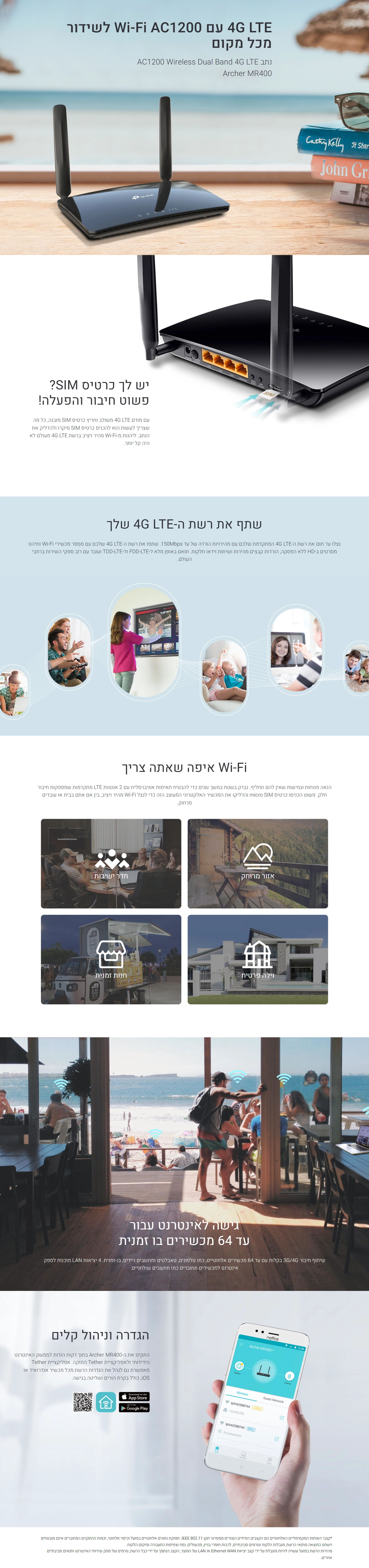 נתב / ראוטר + מודם סלולרי TP-Link Archer MR400 Dual Band 4G LTE עד AC1200